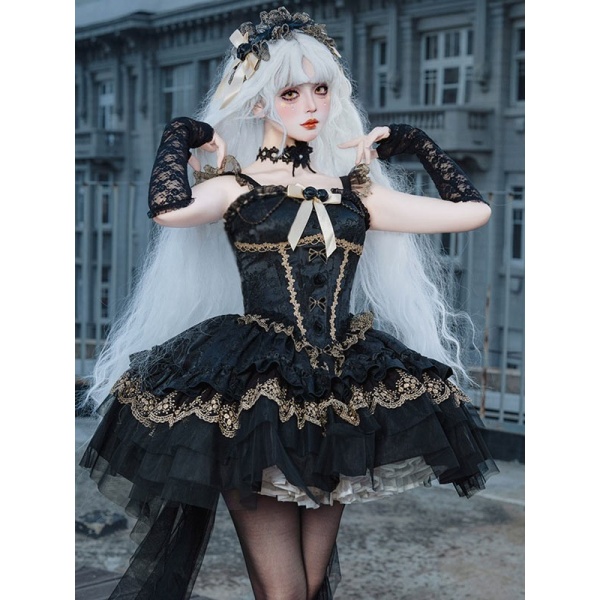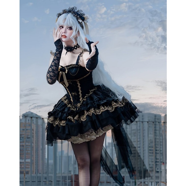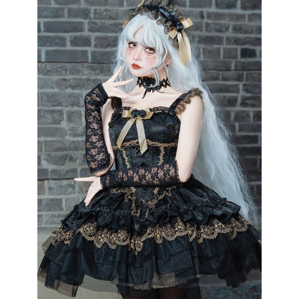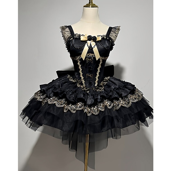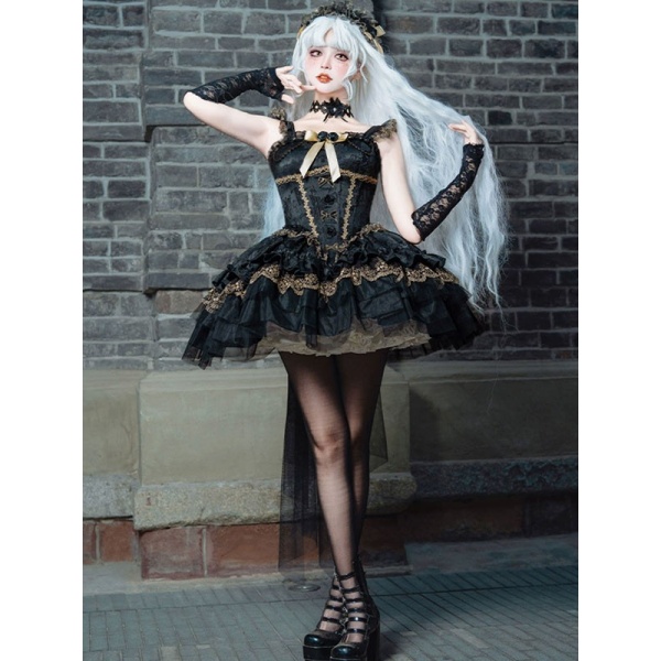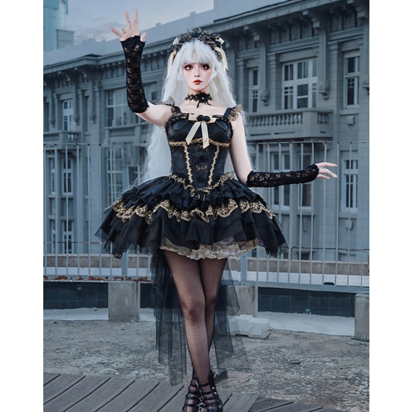 ワンピース ロリータ ハロウィン バレエコア風 ショート丈 ミニ レディース ノースリーブ ゴスロリ ゴシック 暗黒風 ロリィタファッション リボン レース フリル コスチューム コスプレ 衣装 仮装 可愛い パーティー 文化祭 イベント ゴールド ブラック 黒 S M L mj005m4m4m7