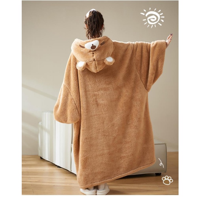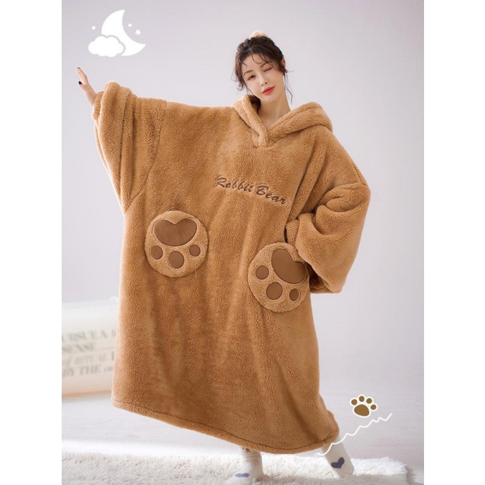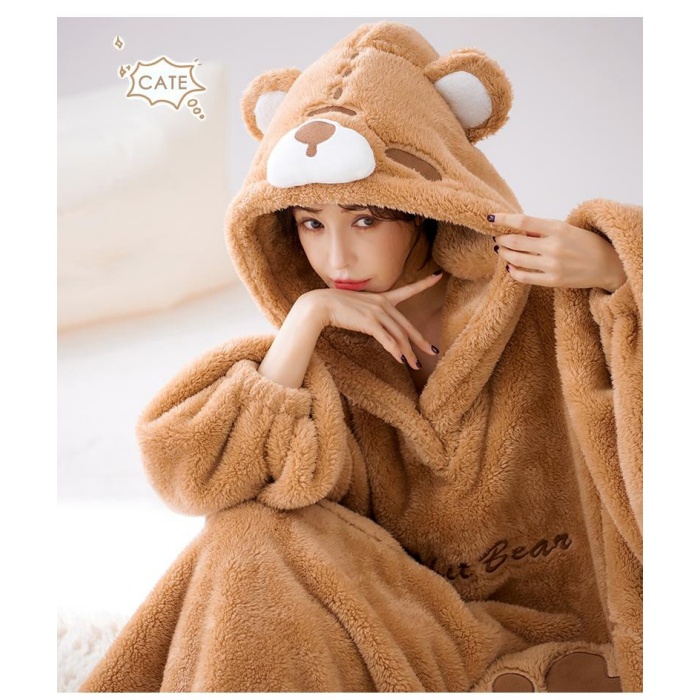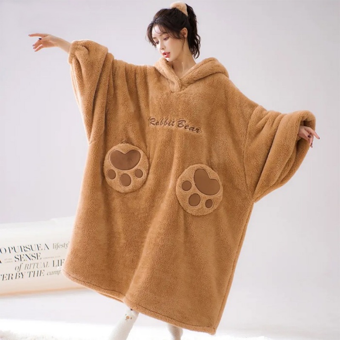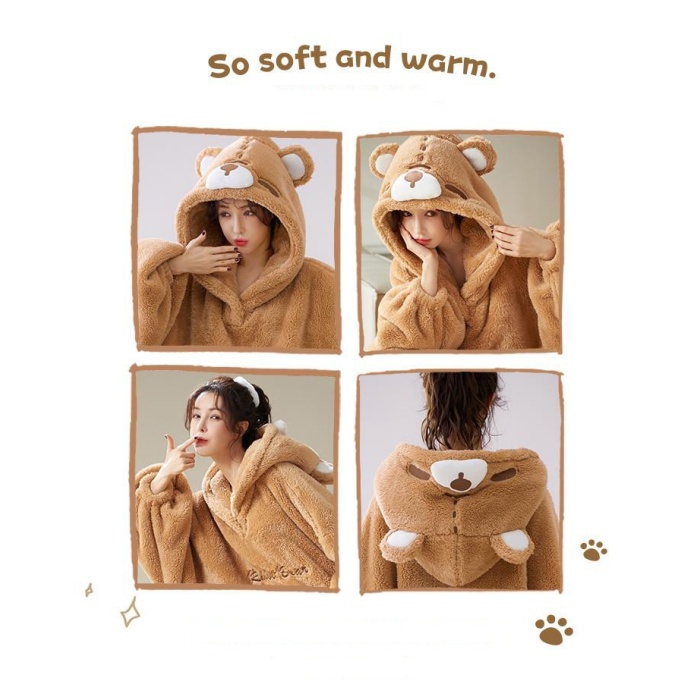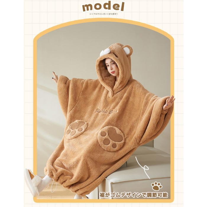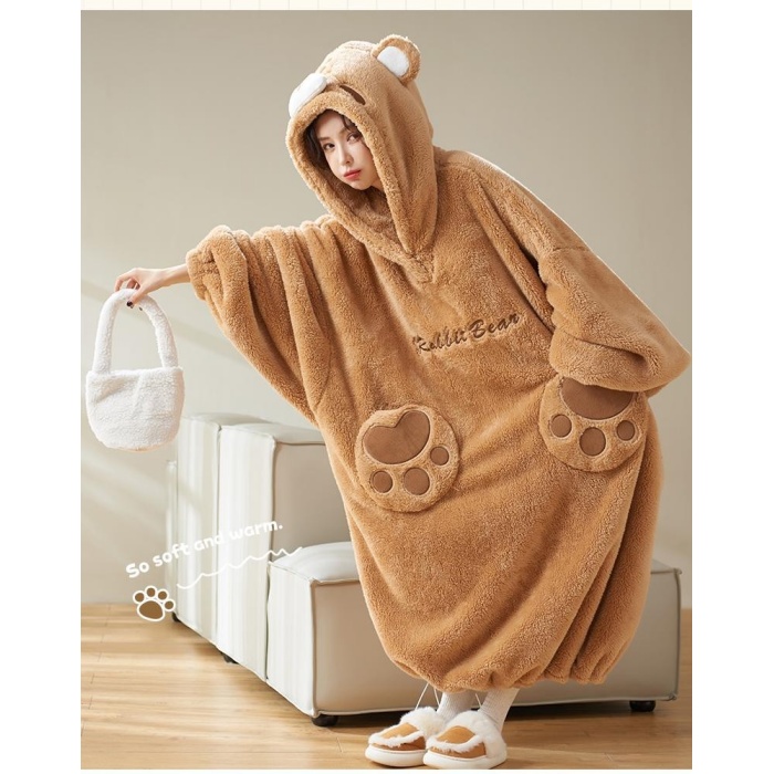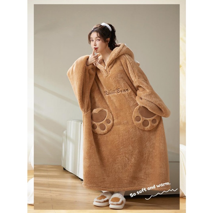 ルームウェア レディース 冬用 着る毛布 長袖 ロング丈 パジャマ もこもこ ナイトガウン フード付き クマ耳デザイン 暖かい あったか 部屋着 動物 着ぐるみ風 ガウン 大人用 ナイトウェア かわいい 可愛い ギフト プレゼント ns008n1n1m7