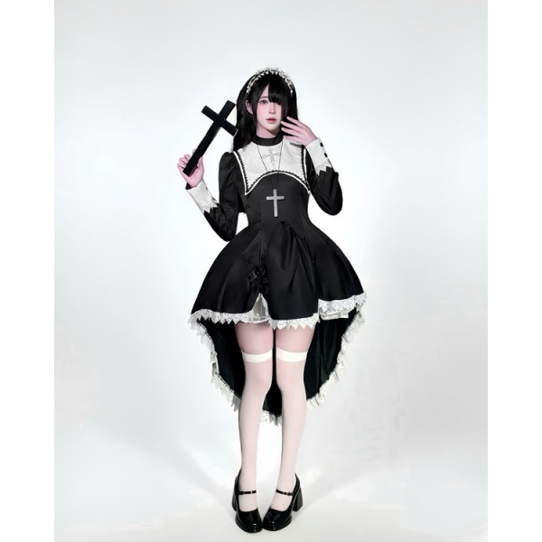 ダークゴシック シスター ドレス 女姓用ハロウィン コスプレ サブカル ゴスロリ刺繍クロス 甘クール 修道服 悪魔 天使 聖女 黒 ブラック パーティー 舞台 演出 コスチューム