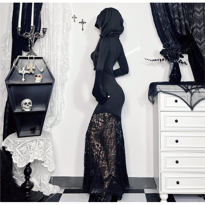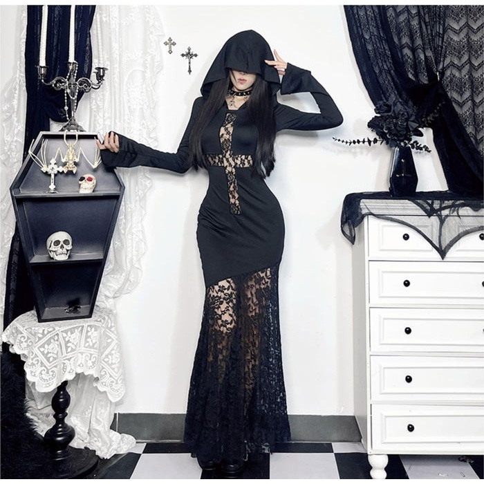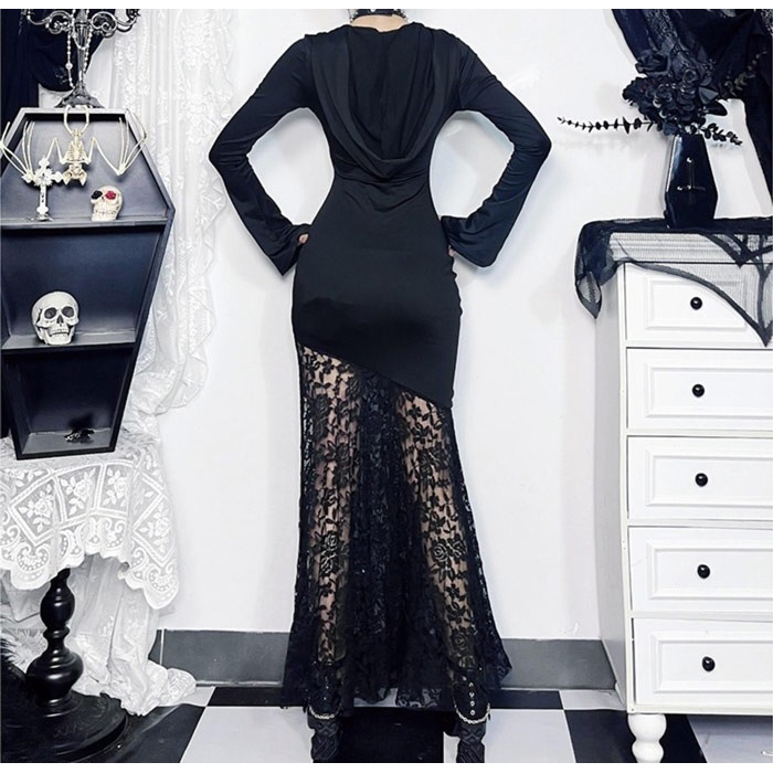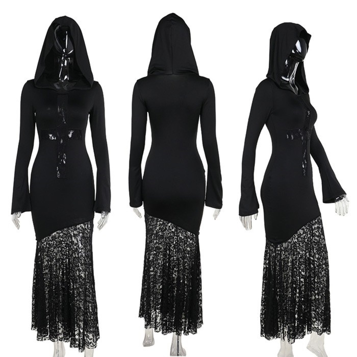 ハロウィン 仮装 ゴシック ワンピース 黒 ロングレース ドレス フード付き コスプレ シスター風 魔女風 モード系 セクシー 大人 レディース S M L ハロウィン衣装 イベント パーティー goth mj007ldldm7