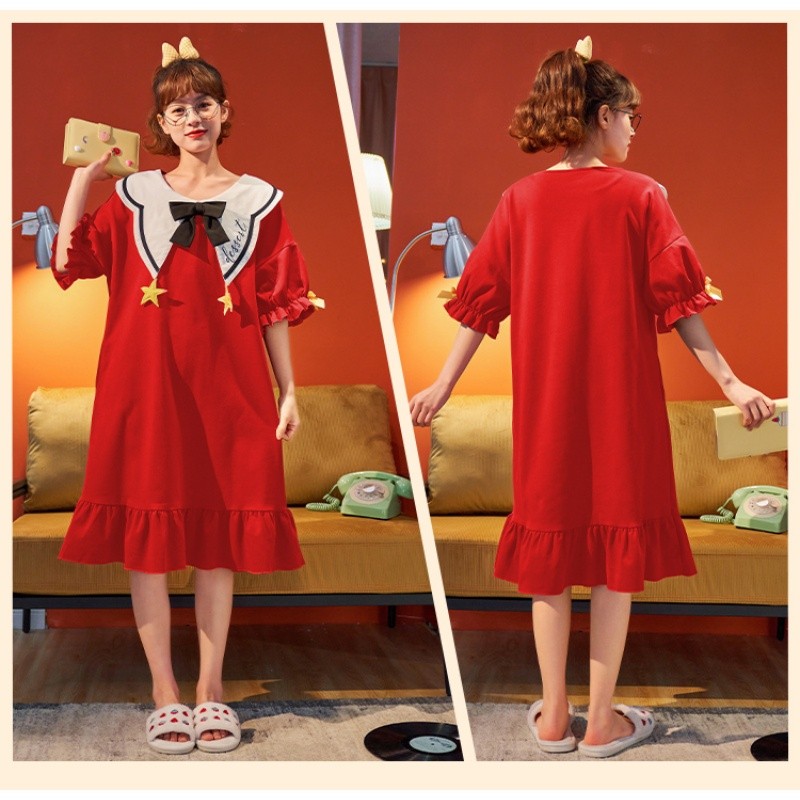 ルームウェア パジャマ セーラー風 ワンピース 上下セット 半袖 かわいい リボン お家時間 ゆめかわ フリル 部屋着 寝間着 サマーパジャマ 春 夏 コットン 女性 かわいい 大きいサイズ ぽっちゃり レディース 誕生日 ギフト 結婚祝い プレゼント レッド