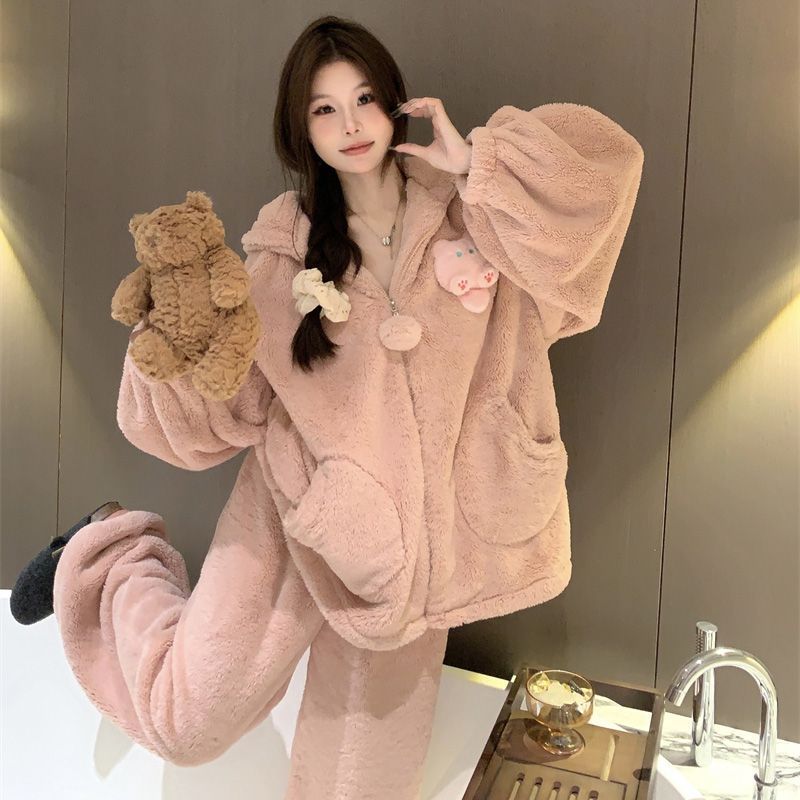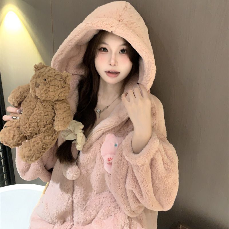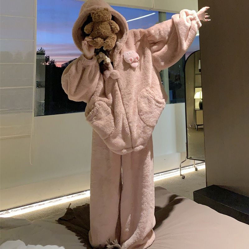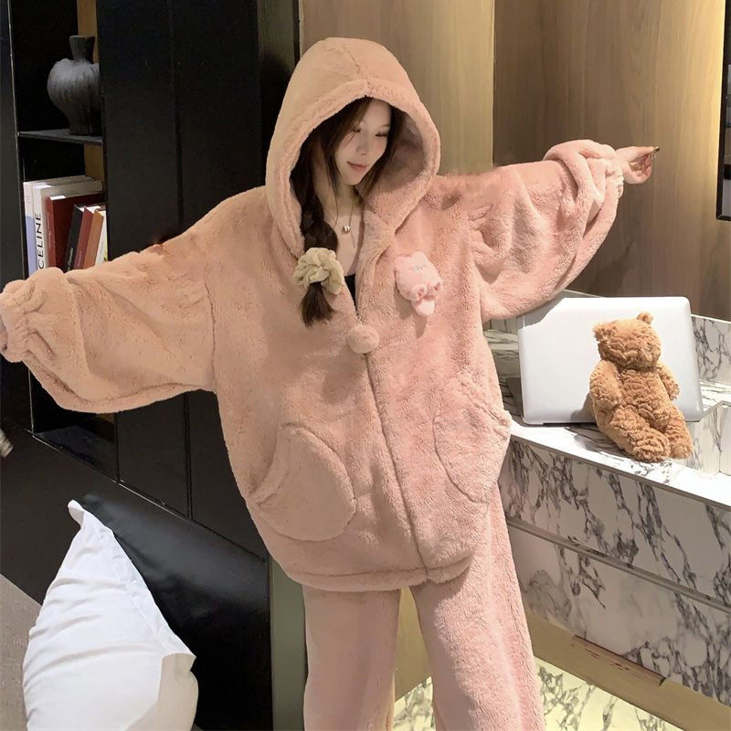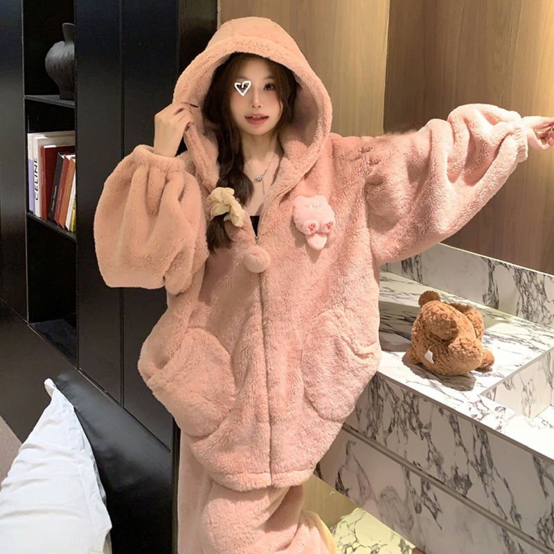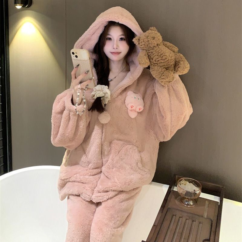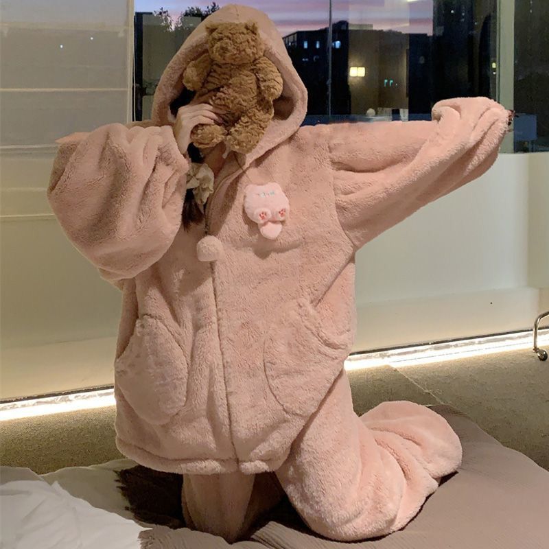 パジャマ レディース 冬 かわいい 長袖 ルームウェア もこもこ 寝巻き 女性用 ふわふわ 前開き 裏起毛 可愛い 韓国 上下セット モコモコ 部屋着 プレゼント 暖かい ロングパンツ 結婚祝い あったか 帽子付き ピンク dh003m7m7m7
