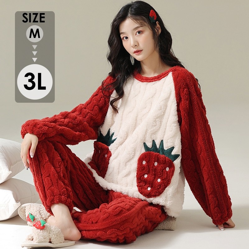 パジャマ 冬 もこもこ 部屋着 イチゴ柄 大きいサイズ かわいい レディース 冬用 あったか モコモコ 誕生日 セット ギフト 結婚祝い プレゼント M/L/2L/3L レッド dg001m7m7m7