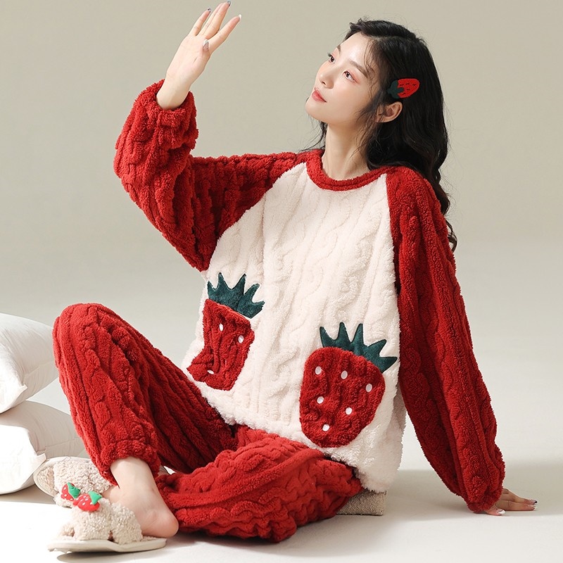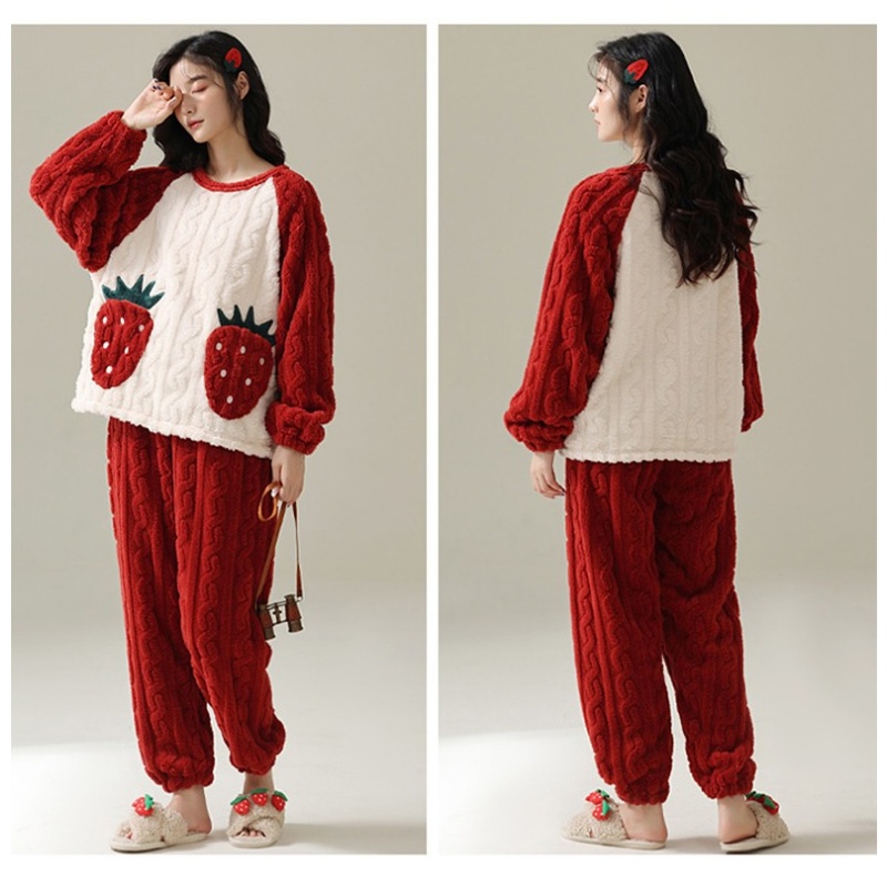 パジャマ 冬 もこもこ 部屋着 イチゴ柄 大きいサイズ かわいい レディース 冬用 あったか モコモコ 誕生日 セット ギフト 結婚祝い プレゼント M/L/2L/3L レッド
