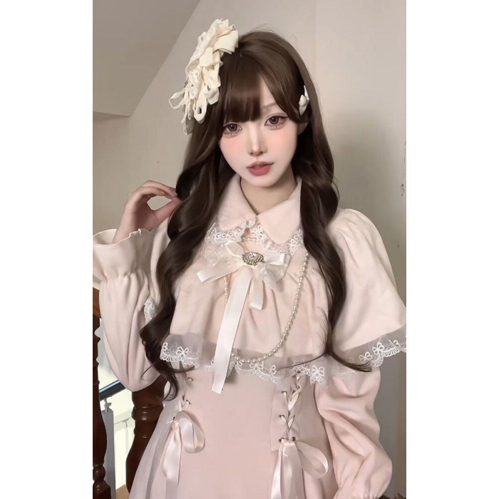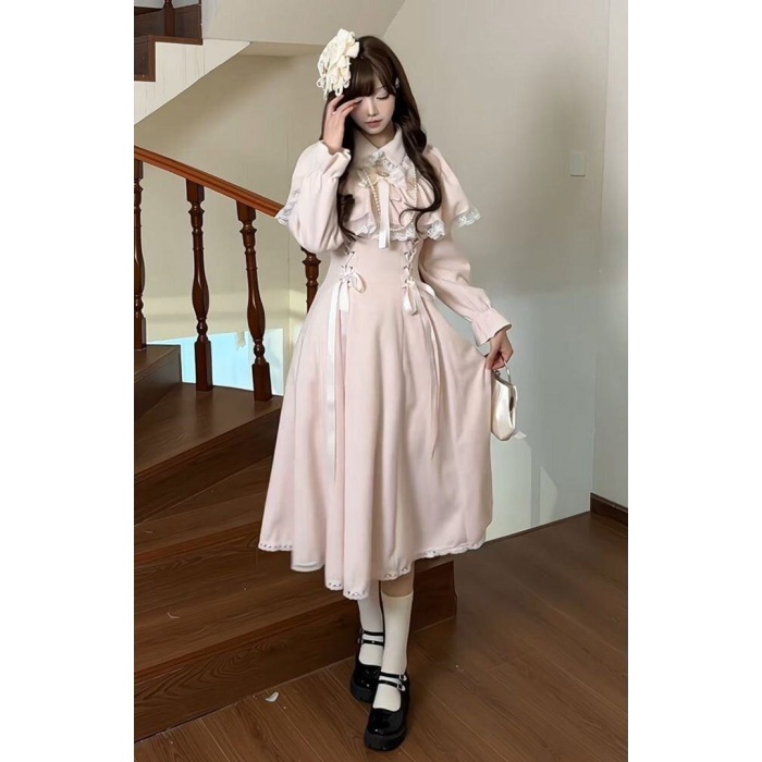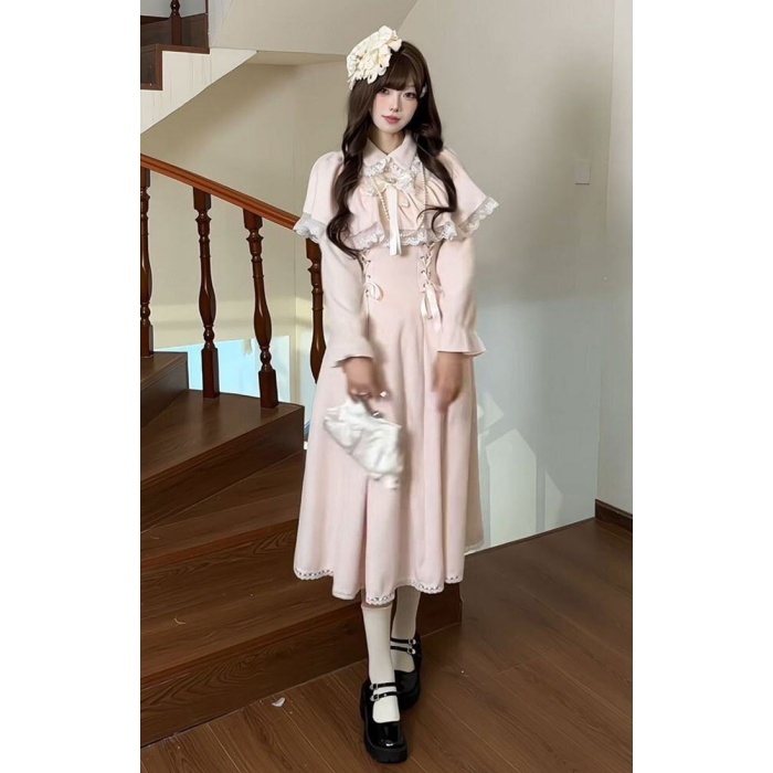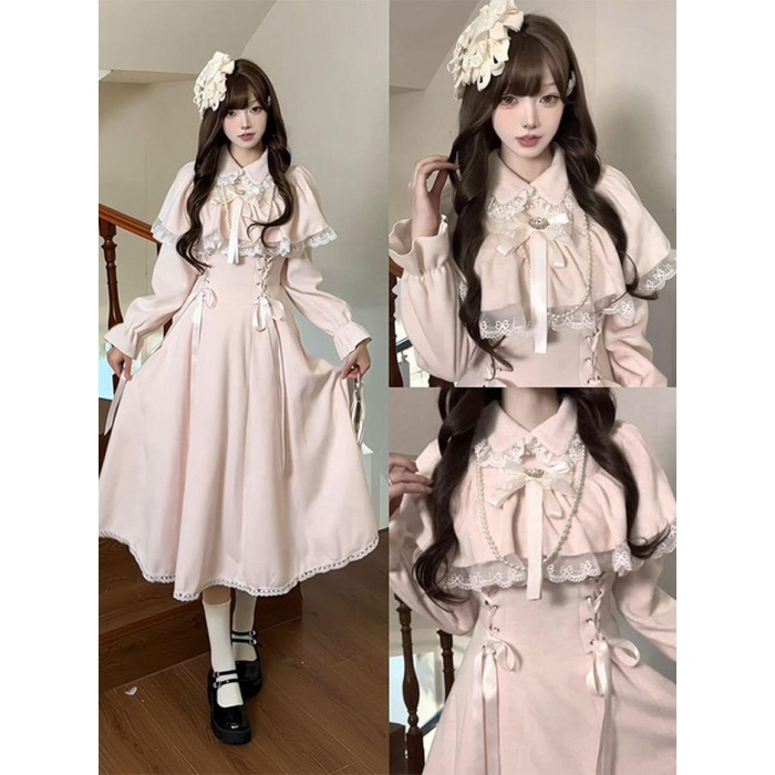 量産型 ワンピース リボン レース ポンチョ風 ロリータ 春 秋 冬 長袖 レディース 女子 リボン ロング丈 切り替え 蝶結び フリル ギャル ドレス かわいい 可愛い 病みかわいい 学生 お姫様 プリンセス お出かけ 通勤 ピンク S M L XL
