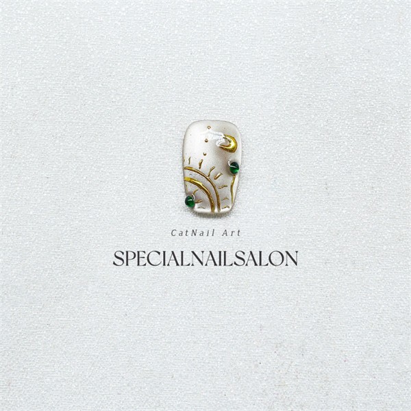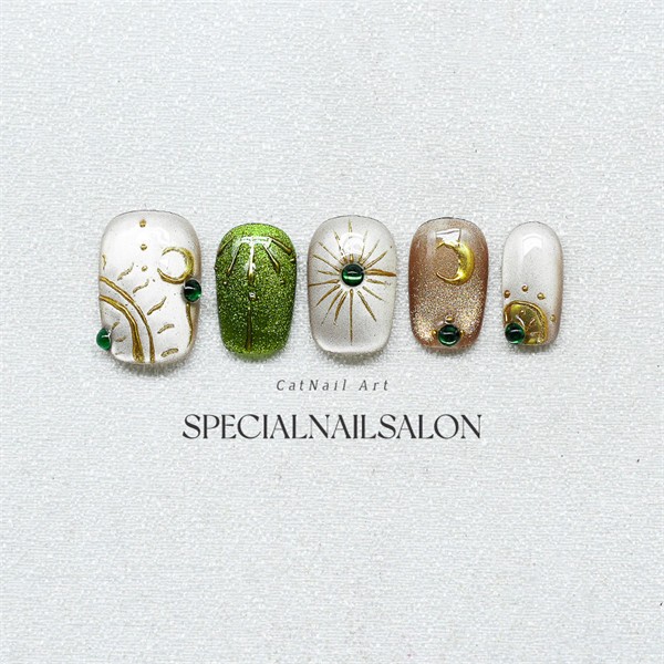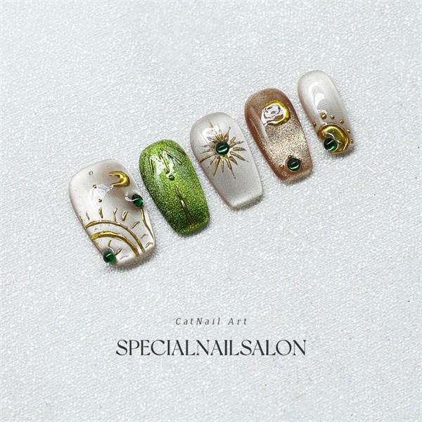 手作り着け爪 ゴールドとグリーンデザイン 光沢感あるネイルアート 簡単に装着でき、繰り返し使用可能nm013z7