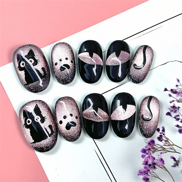 手作り着け爪 黒粉の猫柄デザイン 甜酷なギャル風 白く見せる猫眼ネイル 簡単に装着でき、繰り返し使用可能nm012z7