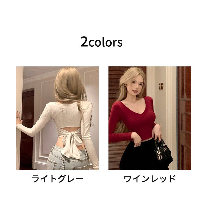 送料無料 クロップド丈 カットソー レディース 長袖 背中開き リボン バックシャン クロップド トップス へそ出し Vネック タイト 無地 ヘルシー 肌見せ セクシー 大人可愛い きれいめ カジュアル 秋 春 S M L 全2色 ワインレッド ライトグレー dd214x1