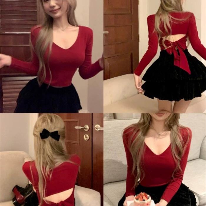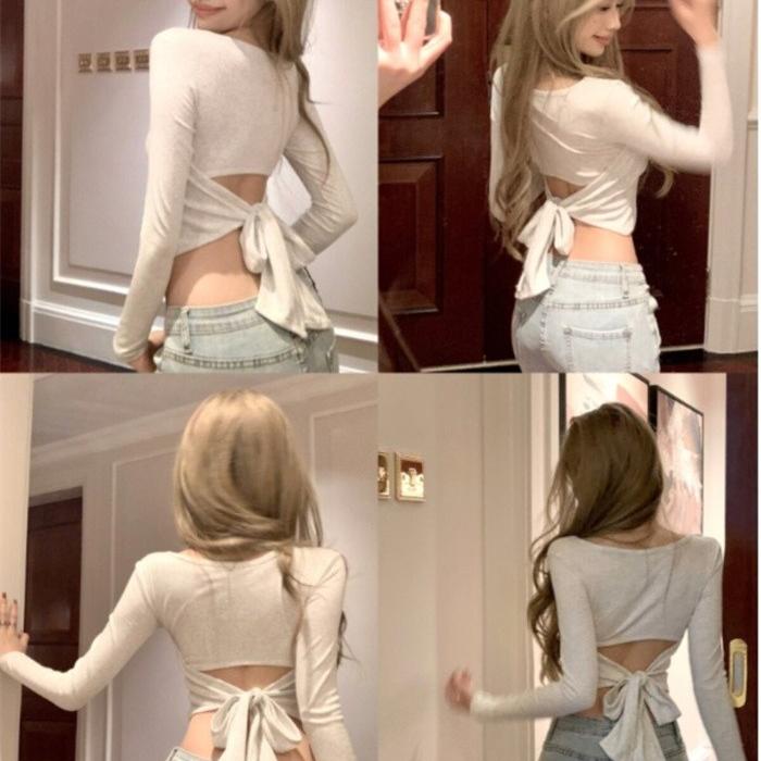 クロップド丈 カットソー レディース 長袖 背中開き リボン バックシャン クロップド トップス へそ出し Vネック タイト 無地 ヘルシー 肌見せ セクシー 大人可愛い きれいめ カジュアル 秋 春 S M L 全2色 ワインレッド ライトグレー dd214x1
