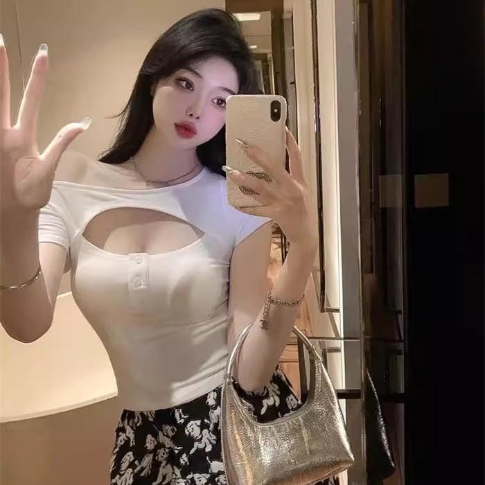 胸開き カットソー レディース 半袖 Tシャツ 胸空き トップス セクシー ヘルシー 肌見せ デコルテ デザイン フロントボタン タイト ストレッチ 無地 大きいサイズ M L LL 3L 4L 5L 春 夏 秋 大人可愛い ブラック ホワイト dd202x1
