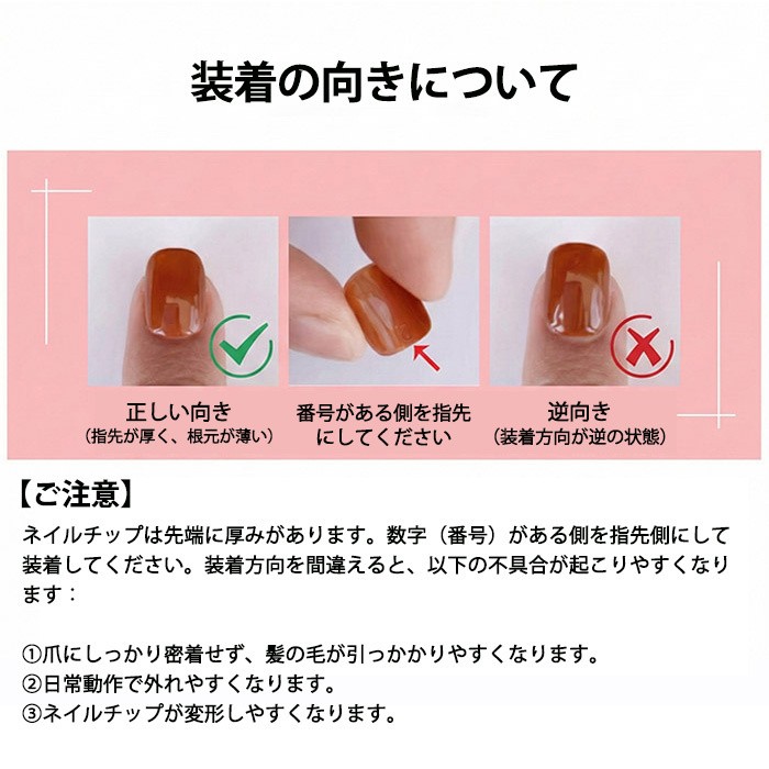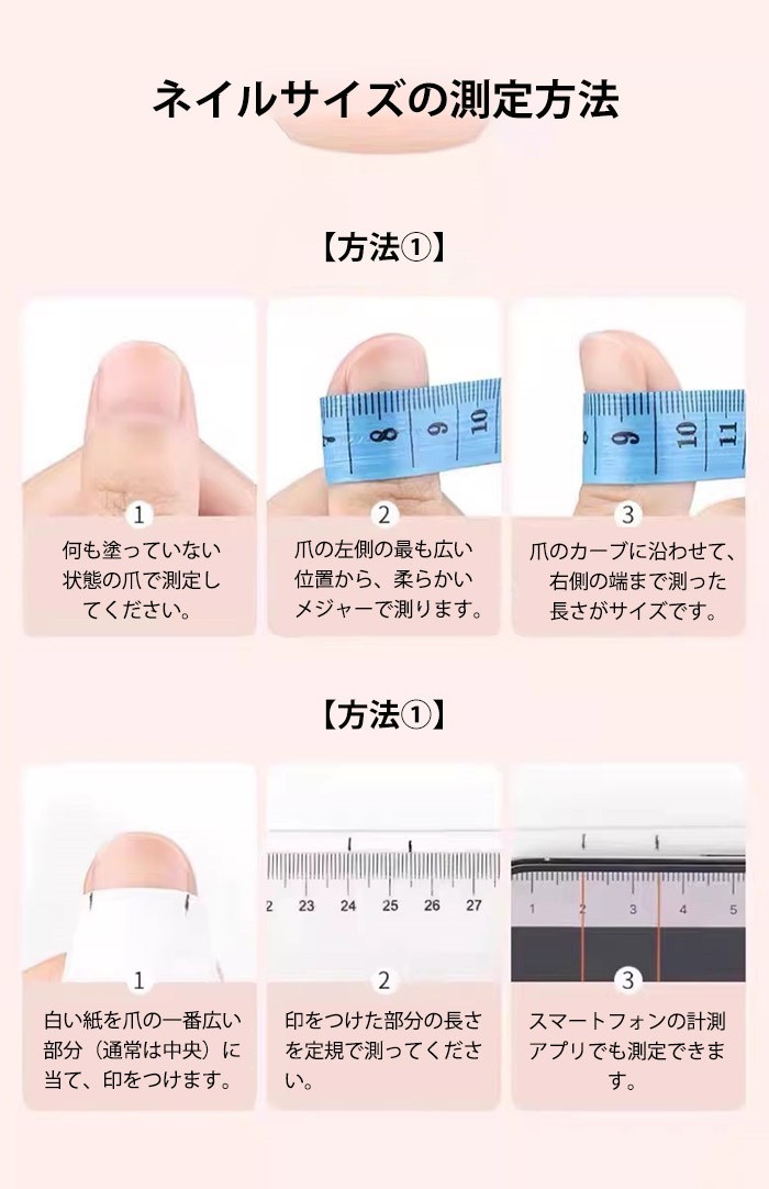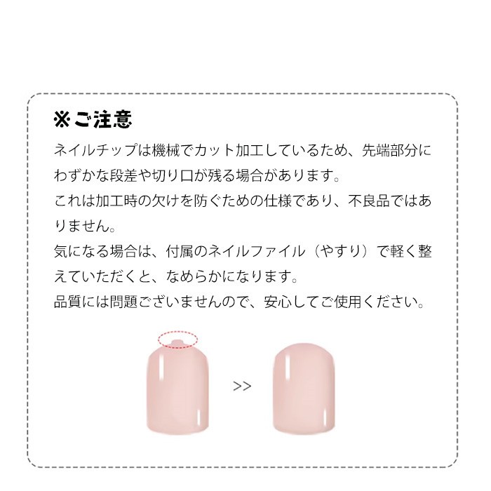 | ◆セット内容 | 両手分ネイルチップ(10枚入り) 同梱品: ①グリーナーシート ②両面ジェルシール ③スティック ④両面ミニ爪やすり ⑤グルー(約2g) 「記載のないアクセサリー、小物等は付属しません」 |