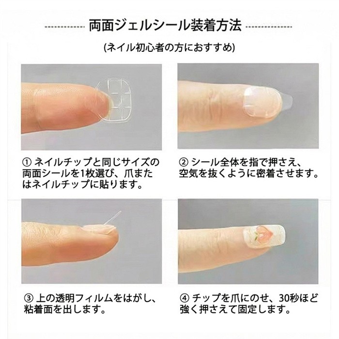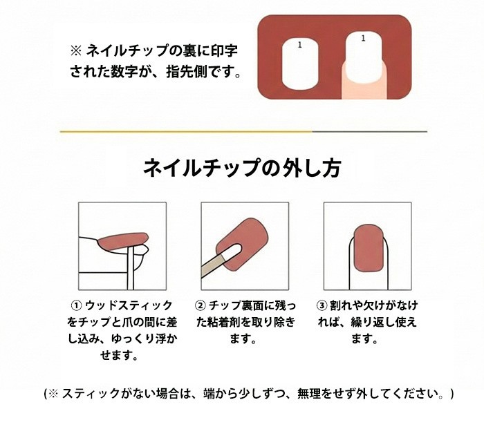 | ◆セット内容 | 両手分ネイルチップ(10枚入り) 同梱品: ①グリーナーシート ②両面ジェルシール ③スティック ④両面ミニ爪やすり ⑤グルー(約2g) 同梱品(専用接着剤/油分除去剤/ウッドスティック/爪やすり) 「記載のないアクセサリー、小物等は付属しません」 |