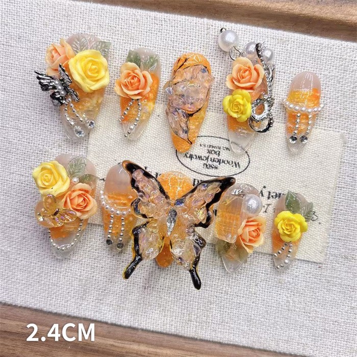 ネイルチップ バタフライ 3D フラワー ローズ 10枚入り 付け爪 オレンジ イエロー ポイント ロング 大ぶり 蝶 花 パール オーロラ ビタミンカラー 地雷系 量産型 サブカル 派手 豪華 ニュアンス 撮影用 イベント 推し活 結婚式 成人式 ギフト プレゼント